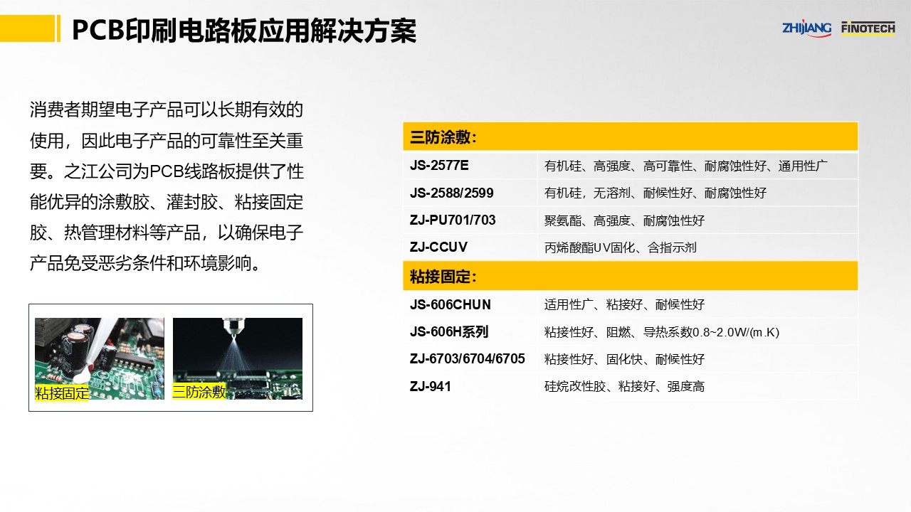 在PCB印刷電路板的組裝方面,之江推出了JS-606CHUN/606H/606H15-01(粘接/導(dǎo)熱/阻燃)、ZJ-686 (透明)等有機(jī)硅固定膠、ZJ-941改性膠、ZJ-PUR900熱熔膠以及ZJ-EP506環(huán)氧膠等產(chǎn)品;