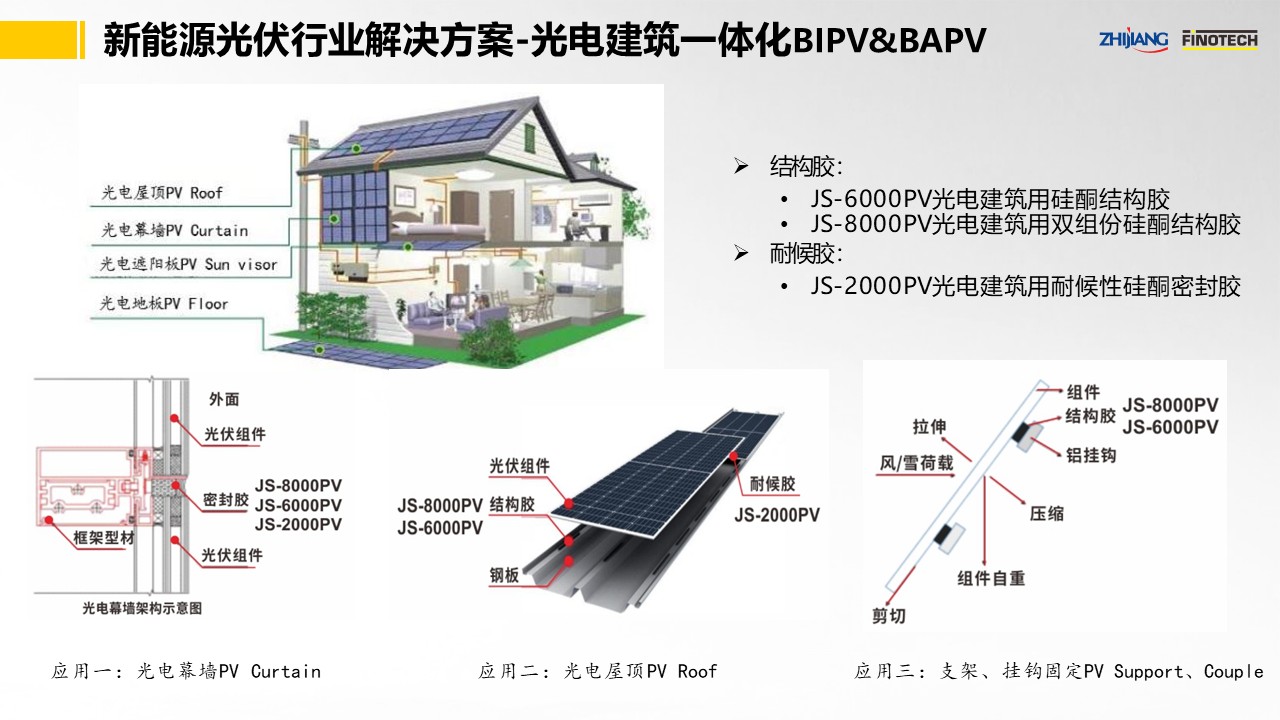 之江公司依托密封膠領域多年的創(chuàng)新平臺,推出了優(yōu)異的光伏行業(yè)用膠解決方案以及光電建筑一體化解決方案,開發(fā)出了性能優(yōu)異的JS-6000PV/JS-8000PV光電建筑用結構膠、JS-2000PV光電建筑用耐候膠等有機硅系列品種,應用于光電建筑幕墻、光電屋頂、組件掛鉤粘接等方面。